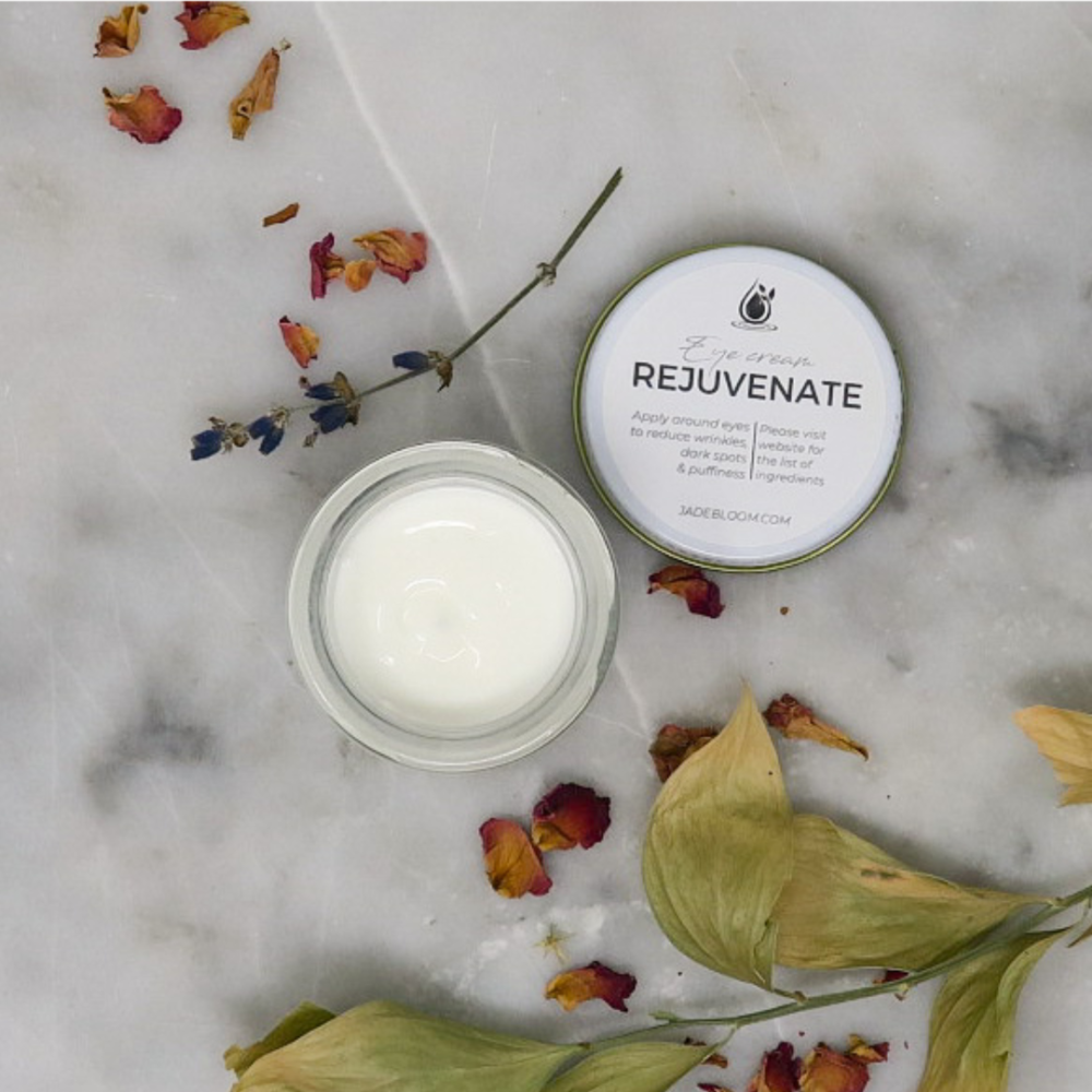 Give the gift of youthful, refreshed eyes with Jade Bloom’s Rejuvenate Eye Cream. Packed with our all-natural Rejuvenate blend, this nourishing formula targets fine lines, dark circles, and age spots, leaving delicate under-eye skin smooth, firm, and hydrated. Known for its soothing properties, it also promotes cell regeneration and reduces puffiness when stored in the fridge for a cooling effect. Perfect for anyone looking to brighten and rejuvenate their eye area naturally.